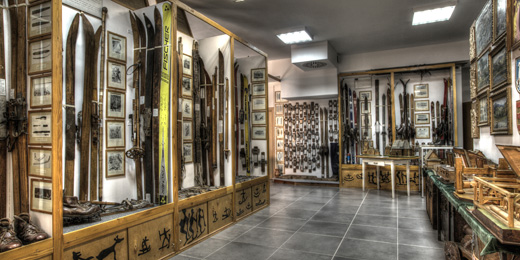 Ścianka ekspozycyjna ze starymi nartami.
